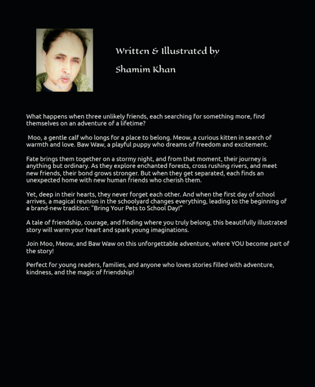 A heartwarming children’s chapter book crafted to inspire kindness, friendship, and adventure, told through the eyes of three lovable animal friends: Moo the calf, Meow the kitten, and Baw Waw the puppy. This enchanting tale is a perfect bedtime read or classroom companion.